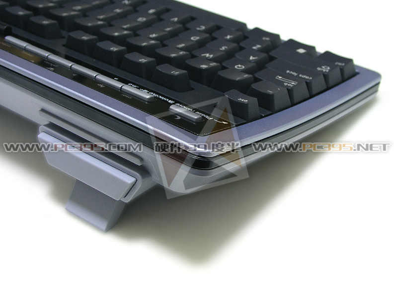 键盘支起来的样子,顶侧有两块大防滑橡胶,整个键盘可以侧立起来,在不用的时候放在一边节省空间。