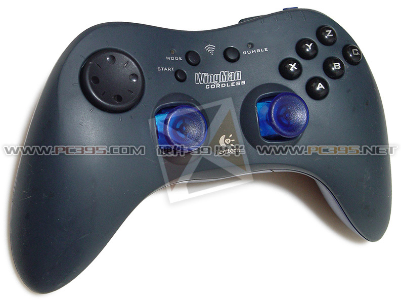 手柄中间的Logitech LOGO,两侧有半透明的2个模拟摇杆,上方有START键、MODE模式切换键、振动开关键,并有两个双色工作指示灯。