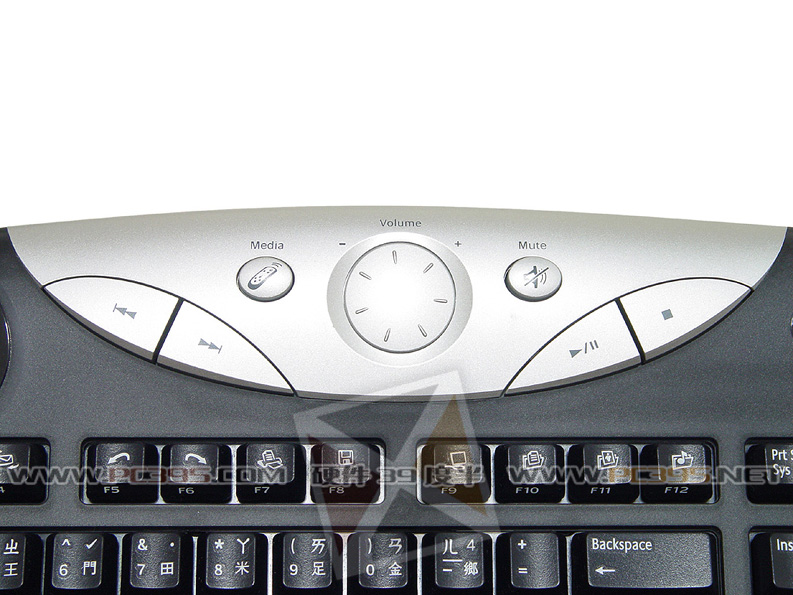 多媒体按键部分,分别是用户自定义、F-Lock、电子邮件、短信、网络摄像头、上一曲、下一曲、多媒体、静音、播放暂停、停止、iTouch、搜索、主页、购物、收藏,正中间有一个音量旋钮。其中F1~F12等功能键配合F Lock功能键会有更多功能。